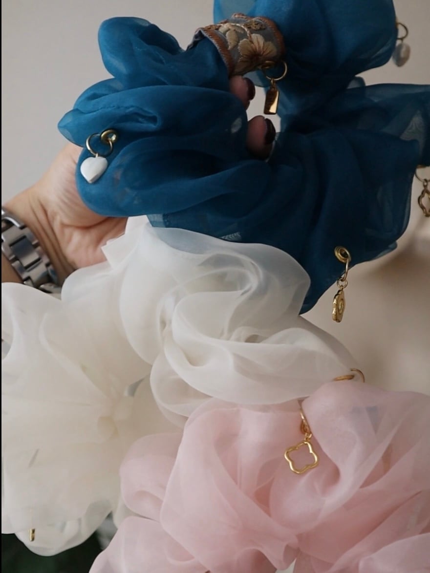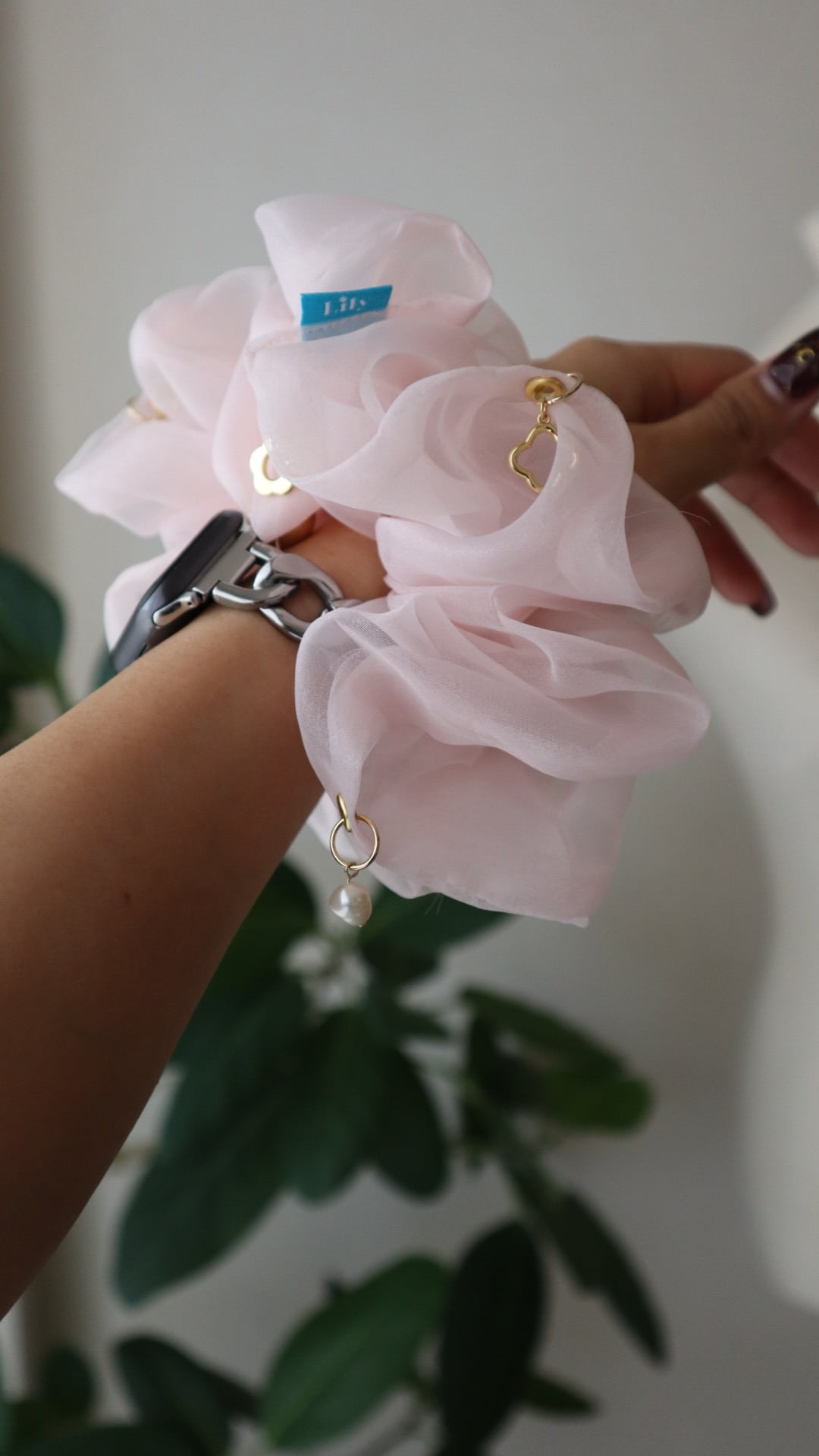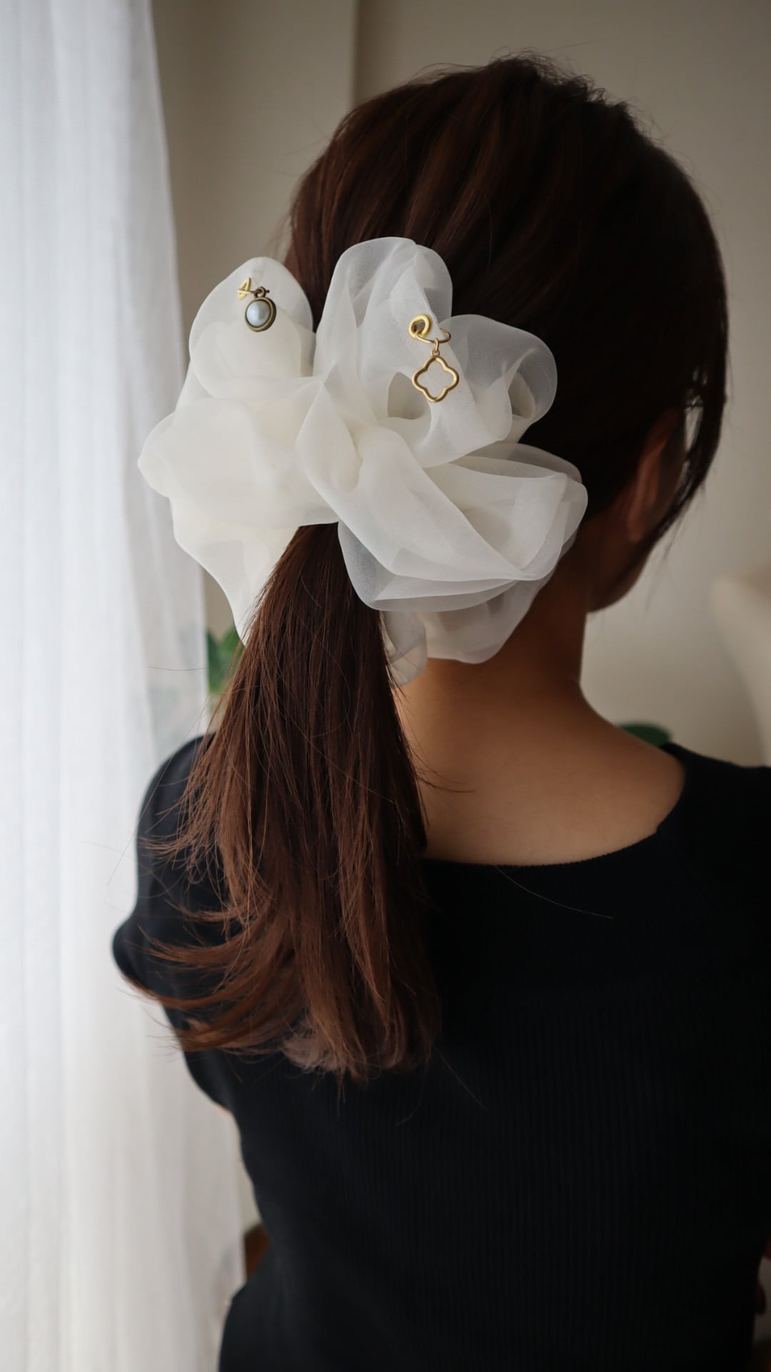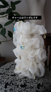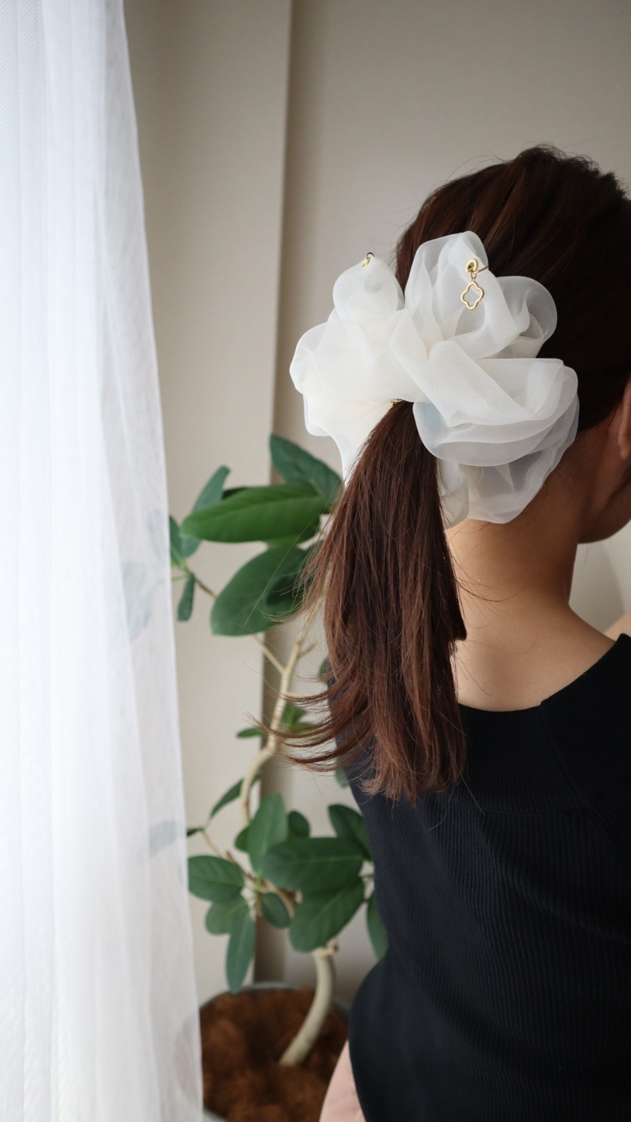 シュシュの端にピアスのようにチャームがついたデザイン。